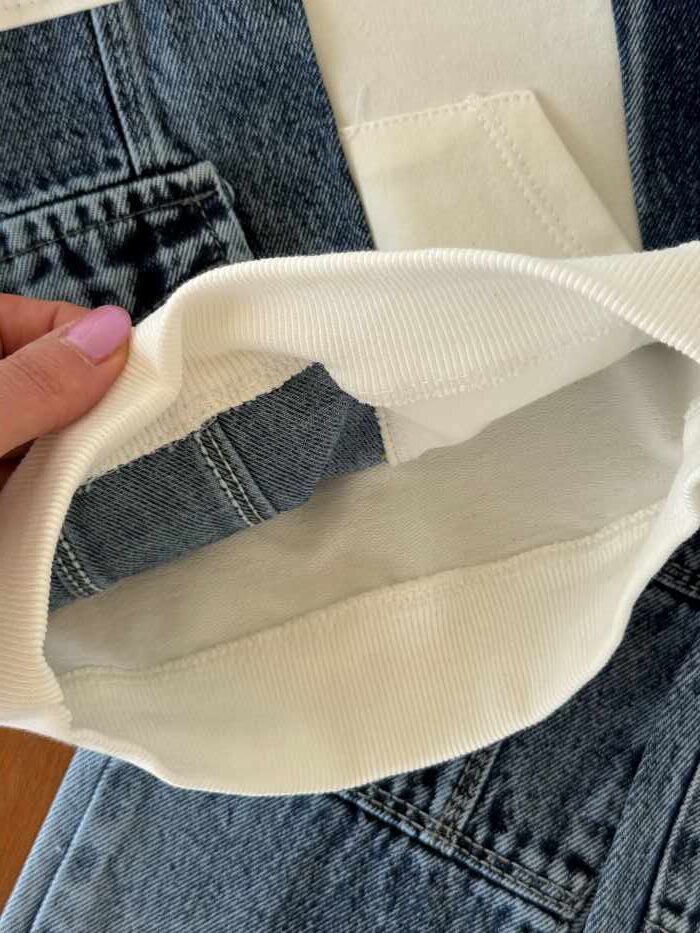 - بلوز: نخ پنبه تیکهدوزی جین – پایه نخ پنبه نرم، تنفسپذیر و ضدحساسیت برای پوست حساس نوزادان و نوپاها + تیکهدوزی جین برای ظاهر اسپرت، جذاب و بادوام. این ترکیب باعث میشود بلوز هم خنک و لطیف باشد و هم ظاهر بیرونی حرفهای و متفاوت داشته باشد.
